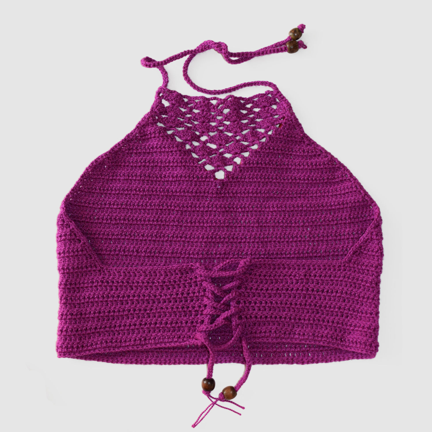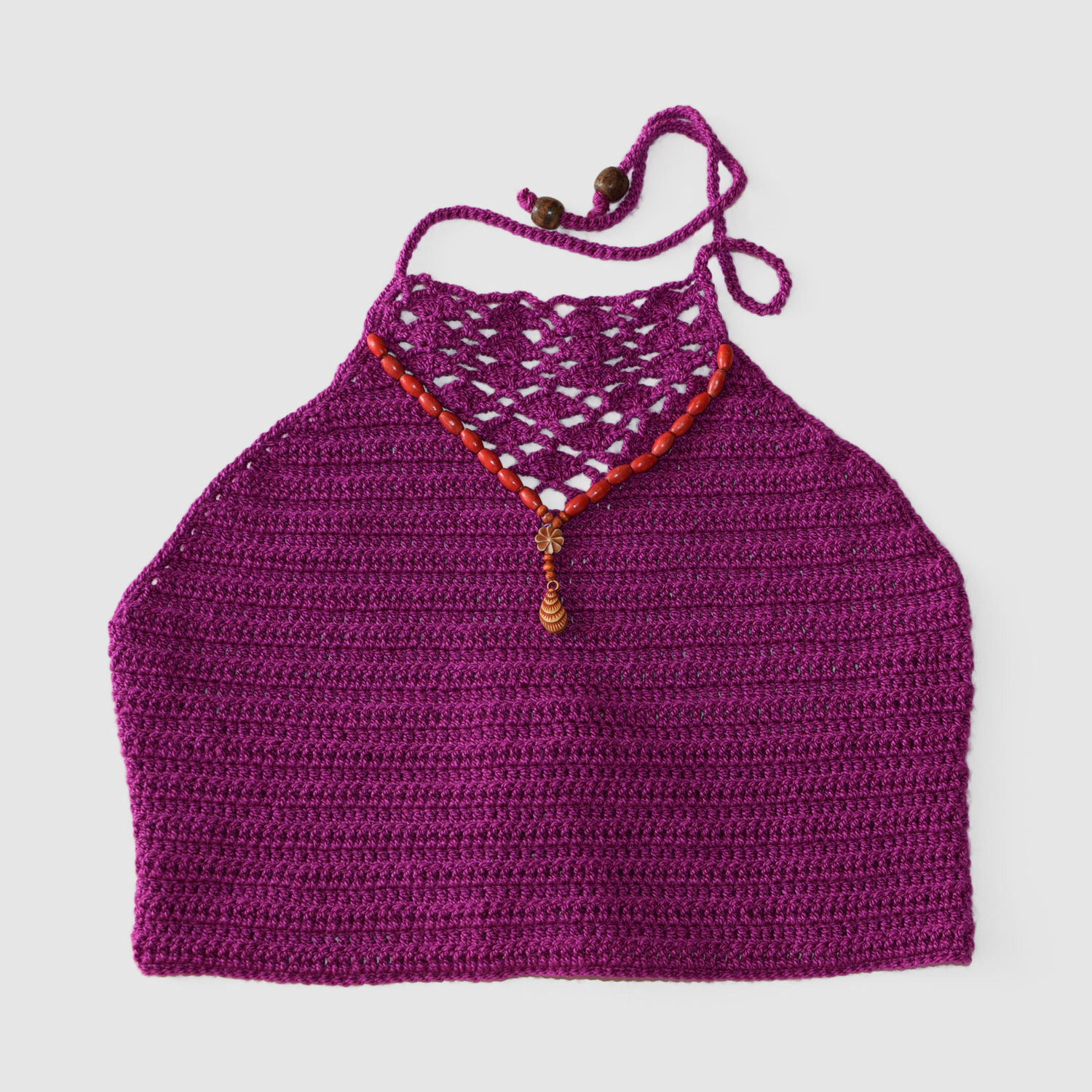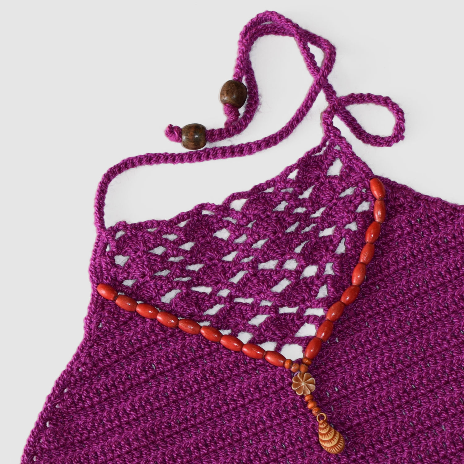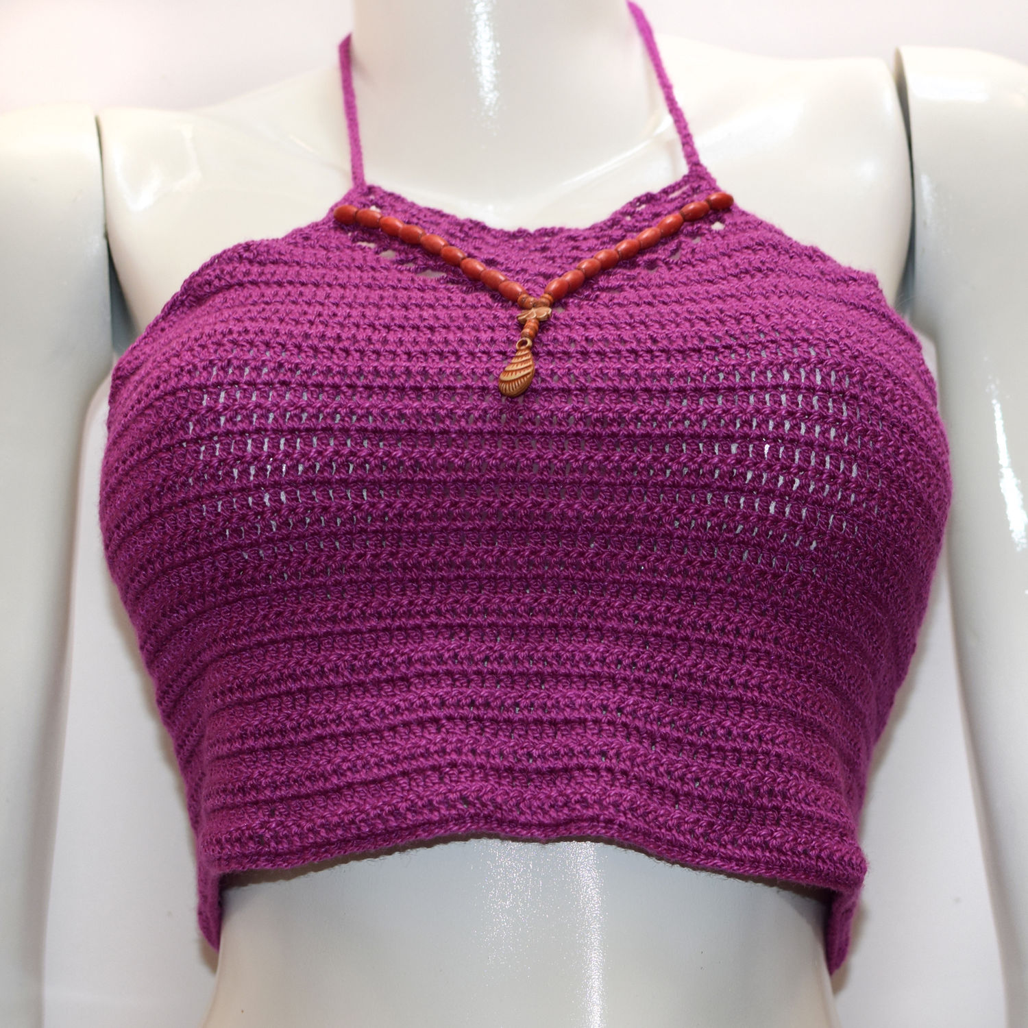 Top tejido a crochet con collar.